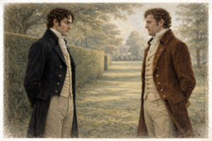 Après son retour du presbytère, Darcy demanda un plateau-repas dans le bureau afin de passer une paire d’heures sur la gestion du domaine de Rosings, Lady Catherine pensa que c’était à cause de leur désagréable discussion de ce matin, mais en fait Darcy cherchait tout simplement à gagner du temps et finir au plus vite son devoir dans cette demeure. En fin d’après-midi, il rejoignit le colonel comme prévu dans le parc pour discuter loin d’oreilles indiscrètes, car il savait parfaitement que la maîtresse des lieux avait pour mauvaise habitude de faire espionner ses invités par ses gens. Les deux jeunes hommes se promenèrent en silence pour quelque temps, jusqu’à ce qu’ils arrivassent à l’une des limites de la propriété. Darcy jugea être dans un endroit sûr.