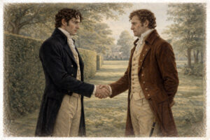 Ensuite Richard lui apprit que le régiment de Wickham aurait à quitter Meryton au plus tard à la fin mai, ce qui mettrait à l’abri les Bennet, et Darcy fut rassuré de ne pas risquer d’y rencontrer son pire ennemi lorsqu’il s’y rendrait pour assister au mariage de Charles, pas par lâcheté, mais bien parce qu’il n’était pas sûr de ne pas le tailler en pièces.