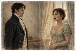 Oui, je sais, c’est terriblement cruel de ma part d’arrêter le chapitre ici. La suite sera-t-elle identique à la scène imaginée par Jane Austen? Tout ce que je vous dirai est que je ne reprendrai pas mot pour mot la même chose…
